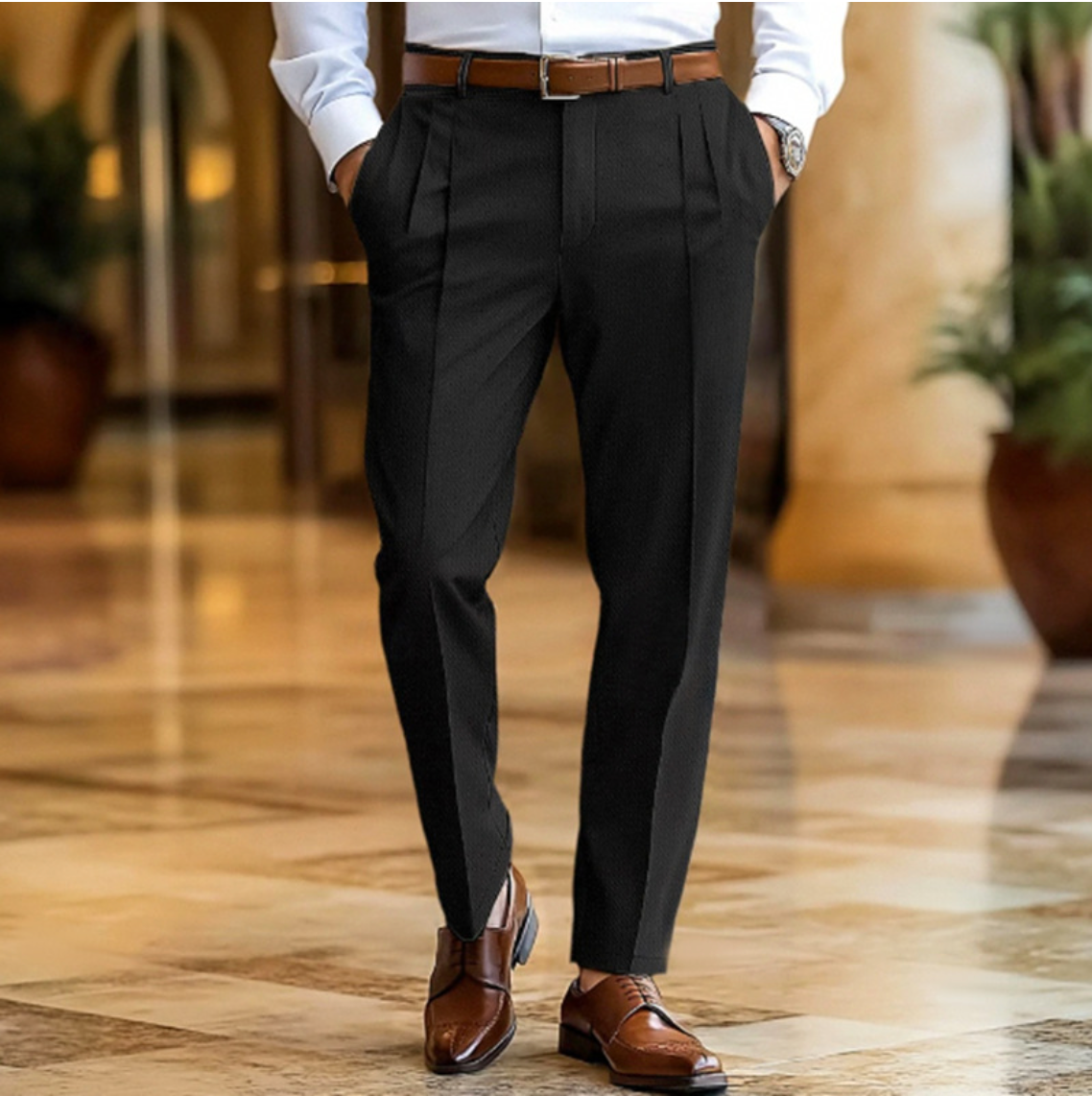 • Slim fit with pleated front design