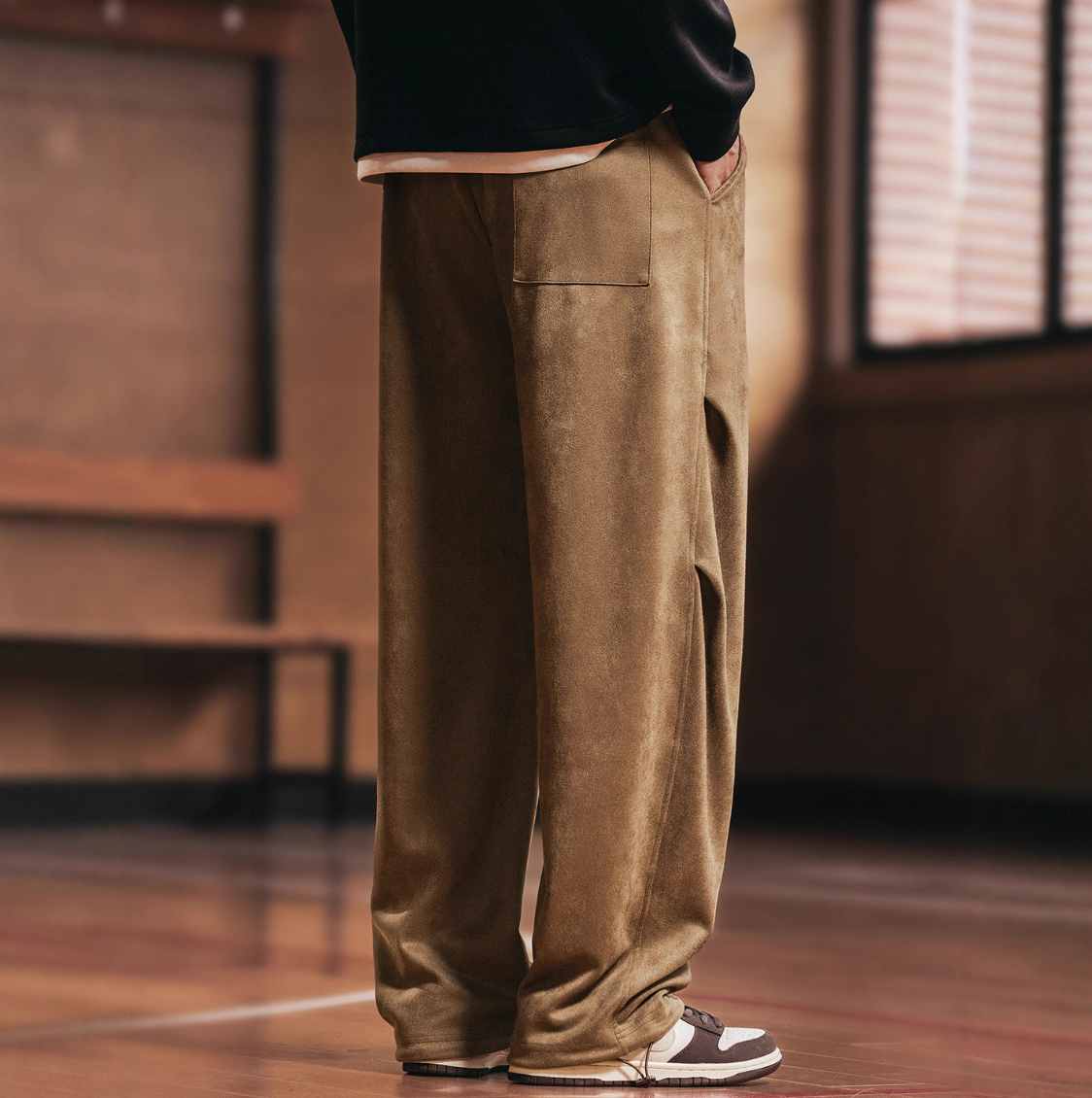 Suede paratrooper pants designed with a wide-leg silhouette and soft finish, making them ideal for travel, lounging, or laid-back style.
