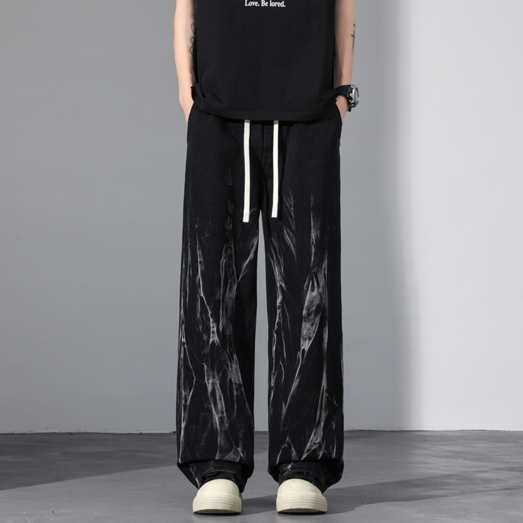 Relaxed straight-cut denim designed for everyday wear, featuring a washed smoke-style pattern that adds edge while keeping a clean, wearable look.